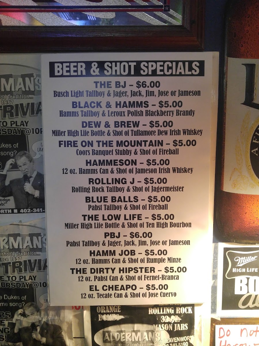 Welcome to Alderman's Bar, a vibrant gem located at 3216 Leavenworth St, Omaha. This neighborhood hangout strikes the perfect balance between a relaxed Irish pub atmosphere and a lively gathering spot. The menu features an exciting range of beer and shot specials, all priced between $7 and $8. Signature drinks like "The Low Life" and "Fire On The Mountain" promise a refreshing experience.
